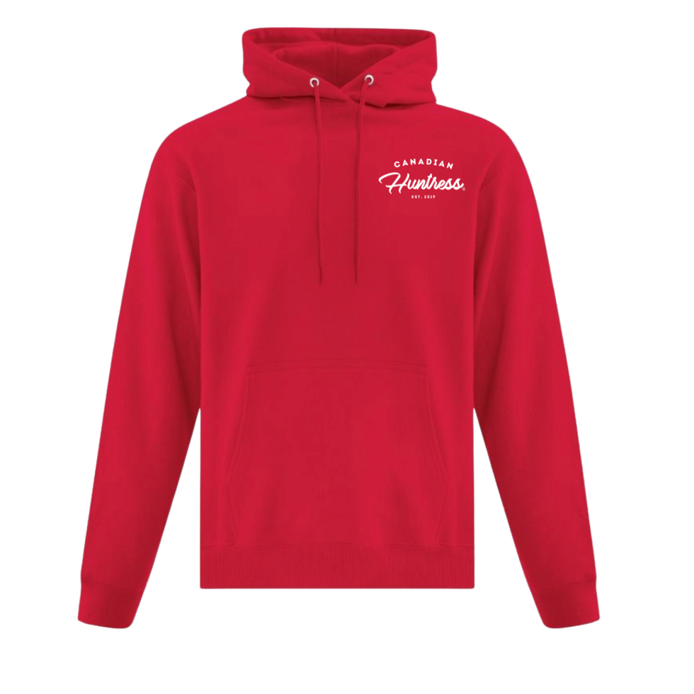 The Canadian Huntress® Everyday Hoodie is made for comfort you can live in. Go subtle with the small left-chest white script, or make a statement with the larger front chest logo. Soft, midweight fleece keeps it cozy without feeling bulky. Easy unisex fit. Wear it everywhere. Repeat.